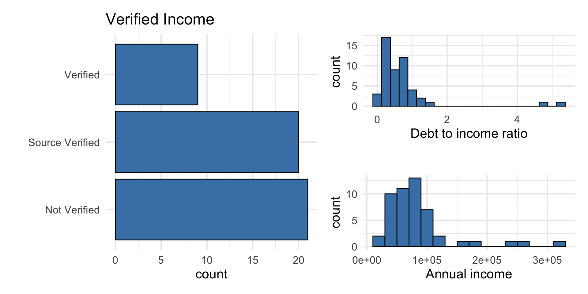 annual_income: Annual incomedebt_to_income: Debt-to-income ratio, i.e. the percentage of a borrower’s total debt divided by their total incomeverified_income: Whether borrower’s income source and amount have been verified (Not Verified,Source Verified,Verified)