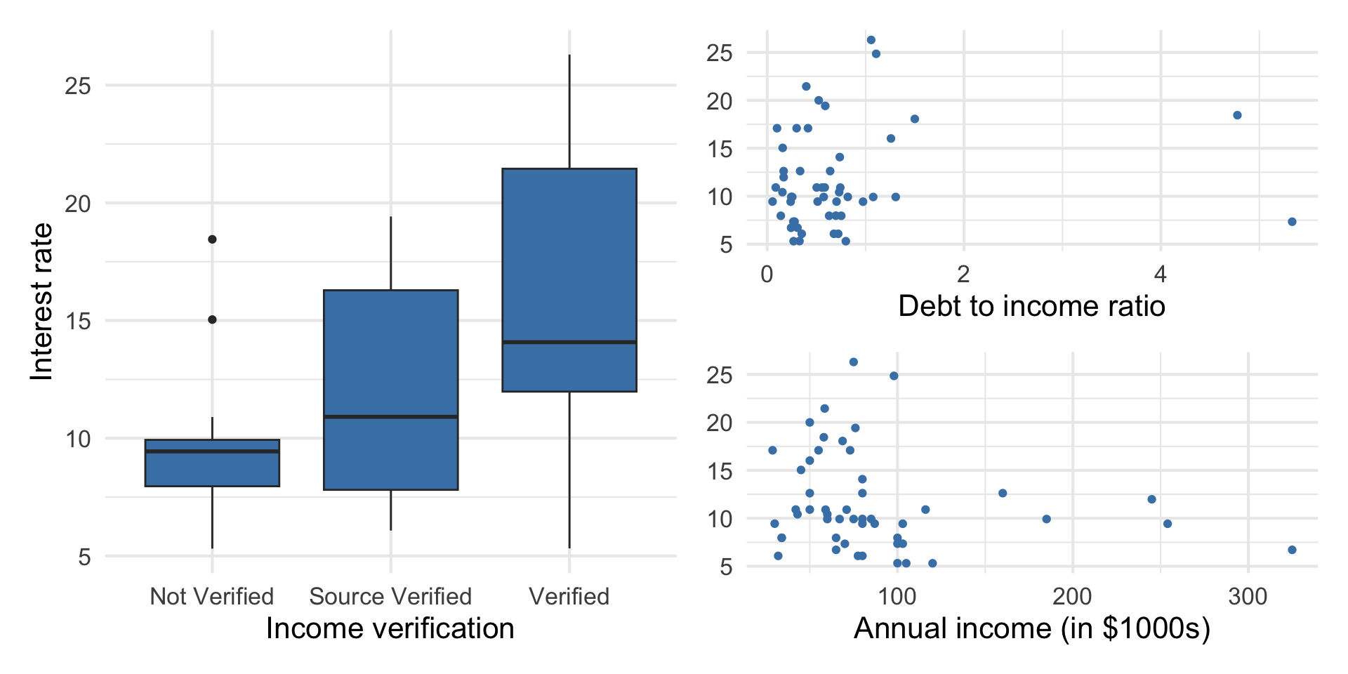 Today’s data is a sample of 50 loans made through a peer-to-peer lending club. The data is in the loan50 data frame in the openintro R package.