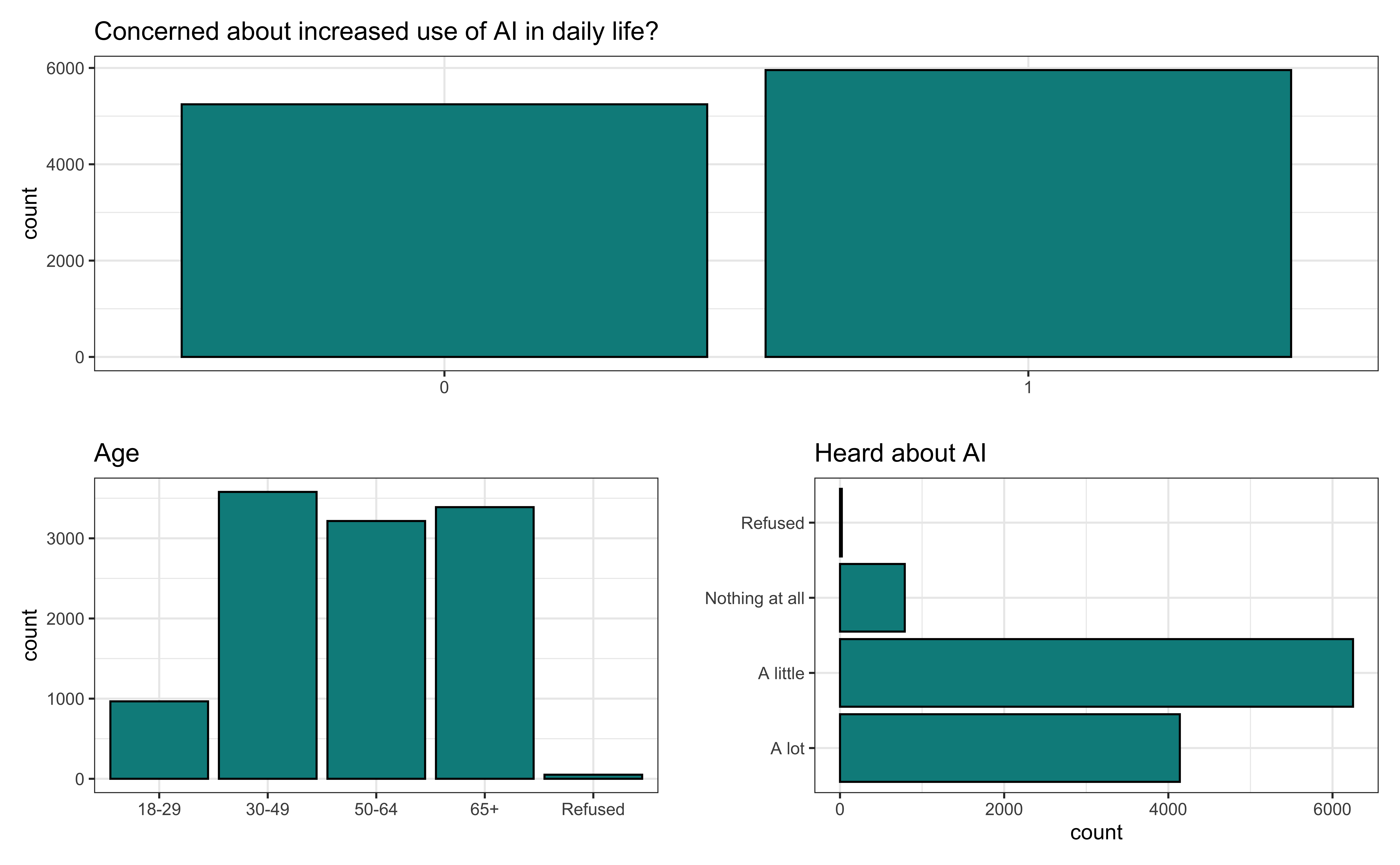 The goal of this analysis is to understand the relationship between age, how much someone has heard about artificial intelligence (AI), and concern about the increased use of AI in daily life.
