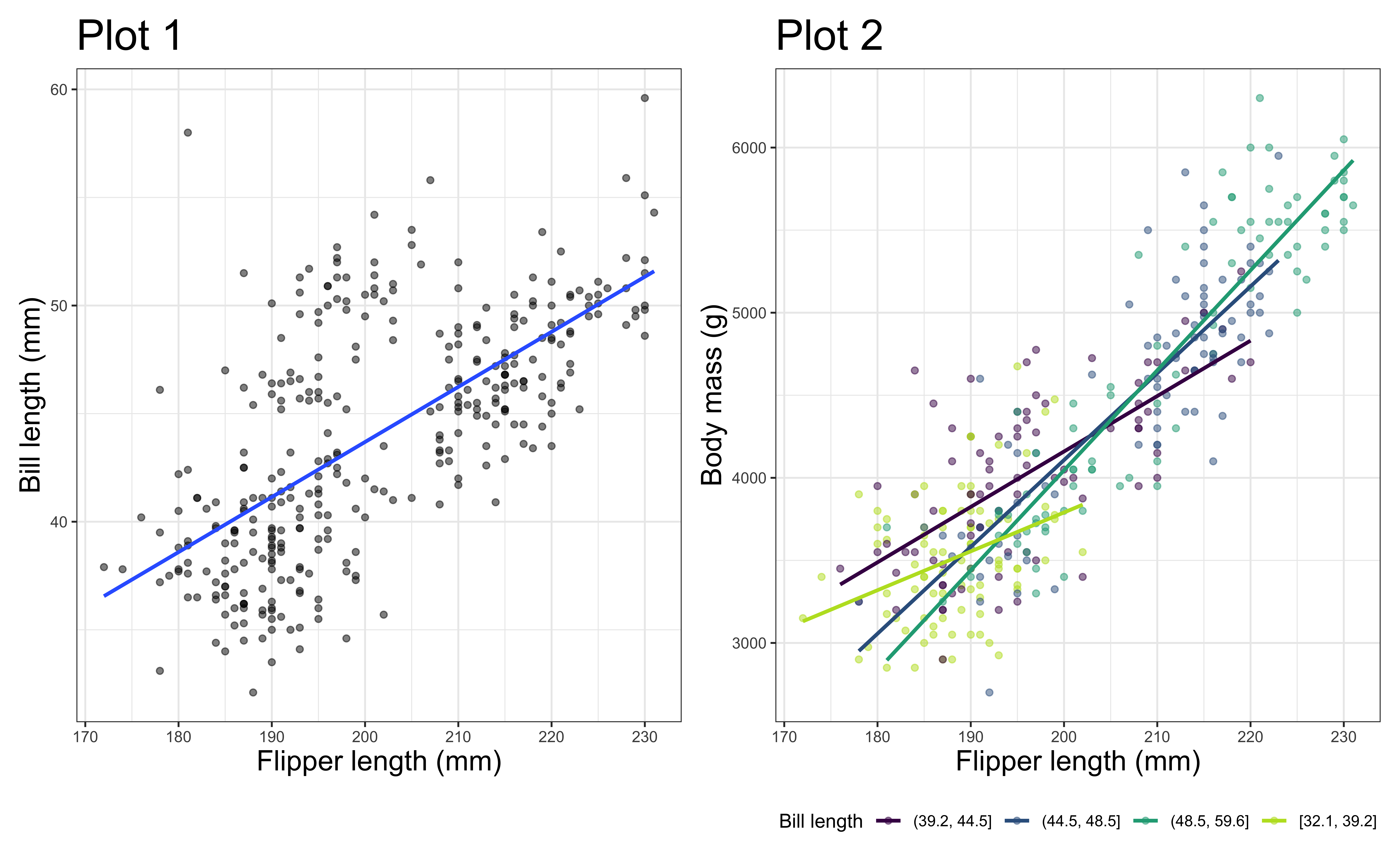 Suppose we fit a model using flipper length and bill length to understand variability in body mass for Palmer Penguins. We make the plots below as part of the EDA.